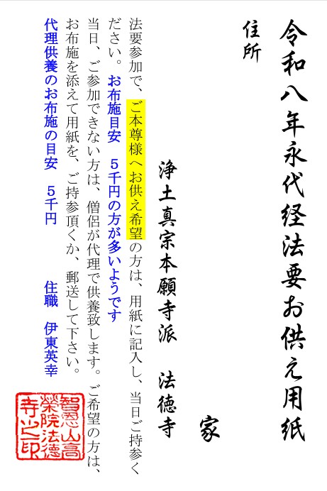 持ち物:過去帳またはお位牌・お供え用紙↓(印刷してお使いください)